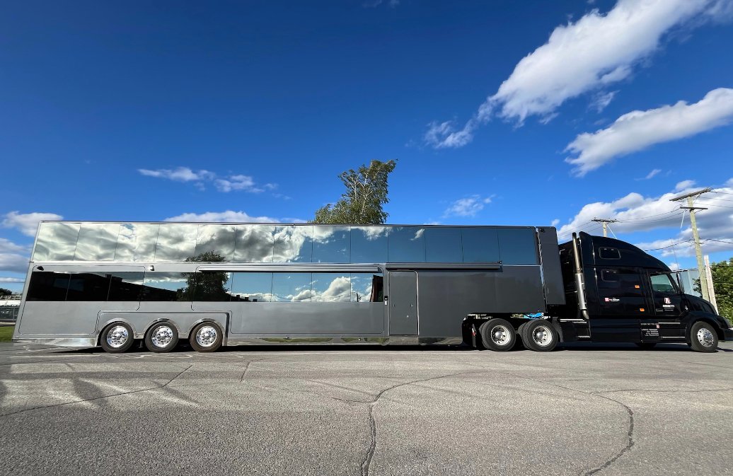 This 1200 square foot luxury RV boasts 3 bedrooms, 3 bathrooms, 2 movie theaters, a hidden bar, a water feature, and a rooftop deck. Weighing 80,000 lbs this beauty is truly one of a kind.